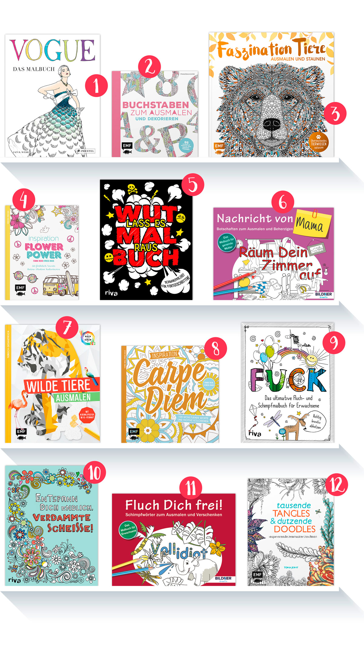 Ich habe einige Malbücher für Erwachsene rausgesucht, die ich euch vorstellen möchte. Meine beiden Favoriten sind die Bücher „VOGUE – das Malbuch“ sowie „FUCK – das ultimative Fluch- und Schimpfmalbuch für Erwachsene“. Diese beiden Exemplare habe ich mir gekauft, weil ich das selbst einmal ausprobieren wollte. Und ja, man kann abschalten beim Aus- und Anmalen der Motive. Wie auch beim Handlettering vergesse ich beim Malen die Zeit und alle Gedanken, die mir bis dahin im Kopf rumgeschwirrt sind. Probiert’s selbst doch auch aus! Wem diese zwei Exemplare nicht gefallen, findet weiter unten weitere Malbücher samt den Bezugsquellen.